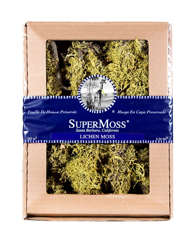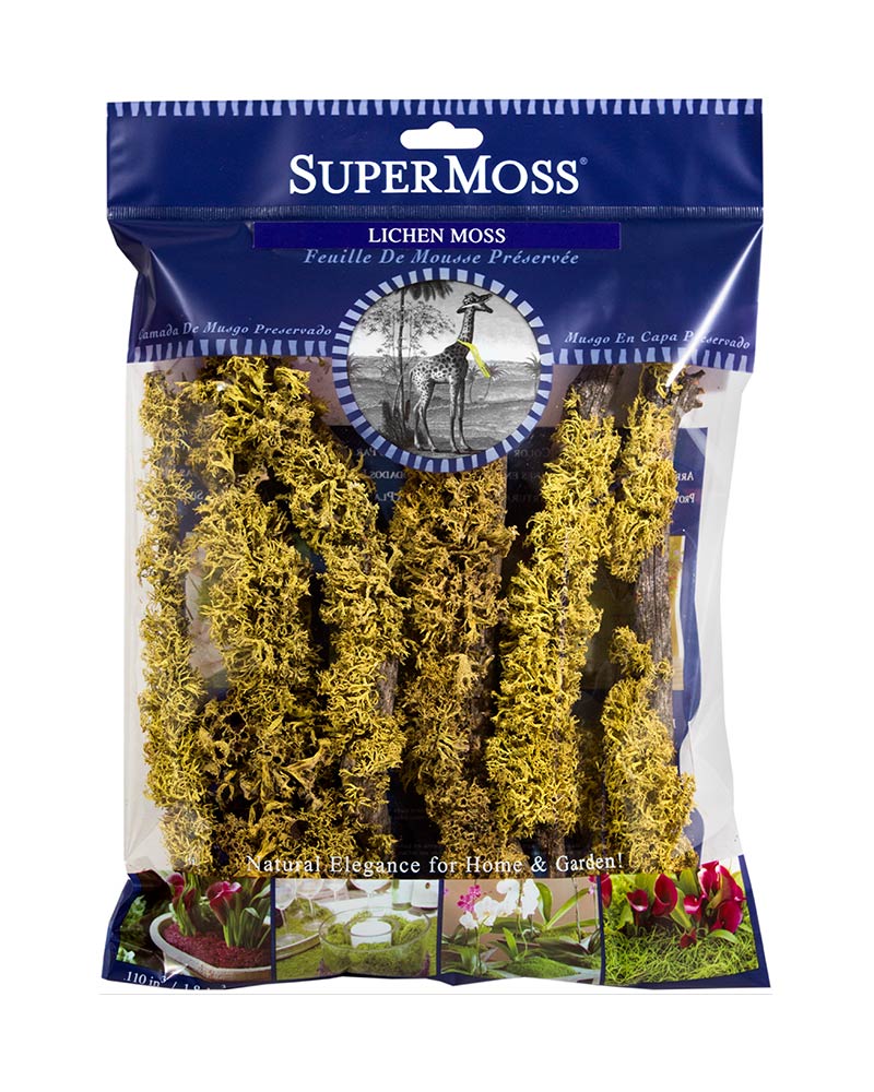 SuperMoss Branched Lichen Wolfen are collected branches with stunning, natural lichen that come in a natural chartreuse color to match various types of arrangements. They range in size from 36 - 44 inches tall and 1/2 - 1 inch thick. They are used to decorate ornamental plants, seasonal arrangements, terrariums, and creative projects. Branched Lichen makes a great off-season fireplace decor used as an accent alongside firewood. Lichen has natural and unique variations in size and texture to create beauty only found in nature. Our product is long-lasting and may be stored and re-used. Available in SuperMoss retail packaging or in bulk quantities.Details