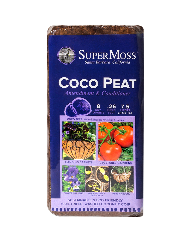 Professional growers are heralding Coconut Peat as the #1 choice in gardening for its numerous inherent qualities. SuperMoss coconut based soils are a superior eco-friendly alternative to peat moss. They absorb 33% more water to prevent root rot and take any guesswork out of watering. By being pH neutral and improving aeration, SuperMoss Coco Peat is ideal for all plants! Lastly, SuperMoss Coco Peat isn't dirty whatsoever, so go ahead and garden in your white linen! Try SuperMoss Garden Bales for your next project! They're easy to load and carry in the car, and can be conveniently stored inside the house or garage. They keep for years and hydrate in minutes. Mini Bales are designed for Hanging Baskets and Indoor Potting, while Small Bales are great for the garden and container gardening. A Small Bale is made of 4 Mini Bales inside for your convenience and savings!Details