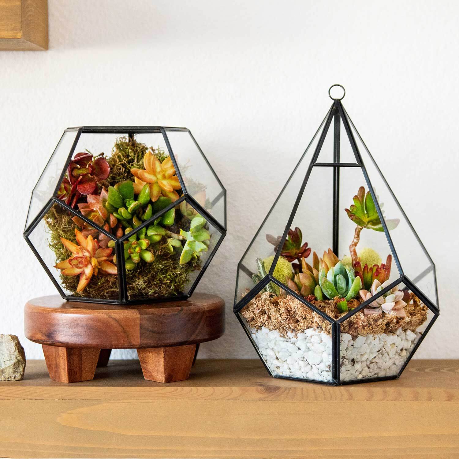 Discover our elegant Glass Terrariums, perfect for creating miniature landscapes that mimic natural environments! Crafted from high-quality glass and lead-free metal frames, these terrariums offer a safe, durable, and visually stunning home for your plants. Choose from a variety of shapes and sizes to suit any décor and personalize your terrarium with plants that match your desired environment. Whether it’s a lush rainforest, desert oasis, or serene moss garden, enjoy the creative freedom to bring a piece of nature indoors with our eco-friendly, beautifully designed terrariums. Opt for an Open terrarium style for a more arid environment for your plants, or an Enclosed style for a more tropical environment. Pair with one of our pre-made DIY Terrarium Kits for everything you need to create a miniature natural landscape within the comfort of your home— and of course, choose your own plants!