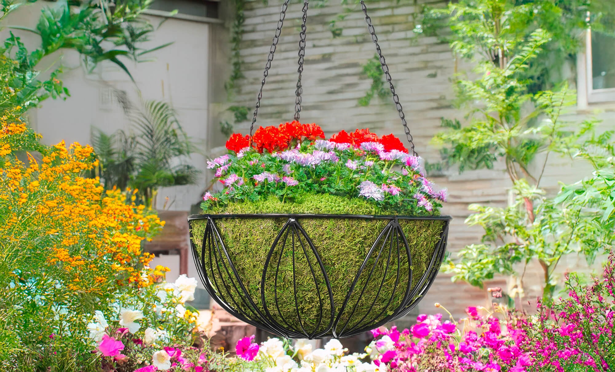 • This hanging pot comes with a designer chain already attached and a SuperMoss, preserved moss planter liner