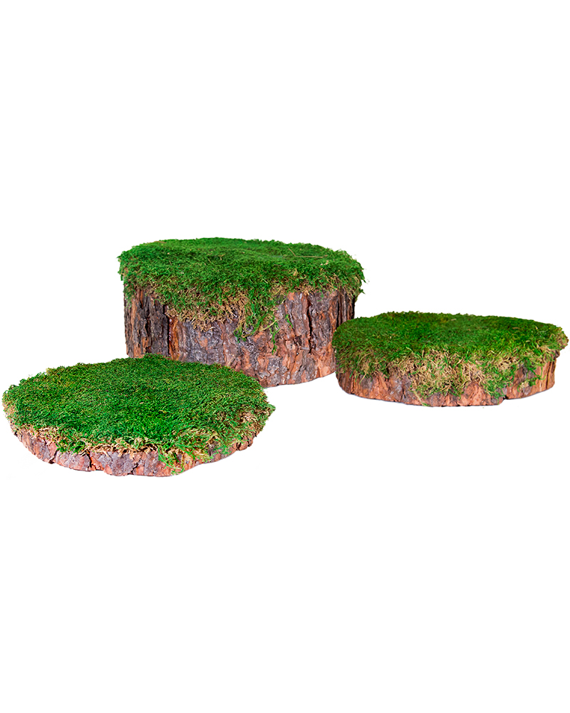 Mossy Tree Stumps are ideal for floral events, woodland weddings, centerpieces, and fairy gardening. They can be used to create elevated terrain in a fairy garden or highlight certain items in a wedding buffet or centerpiece. They are made from natural pine and 100% real Sheet Moss.Details