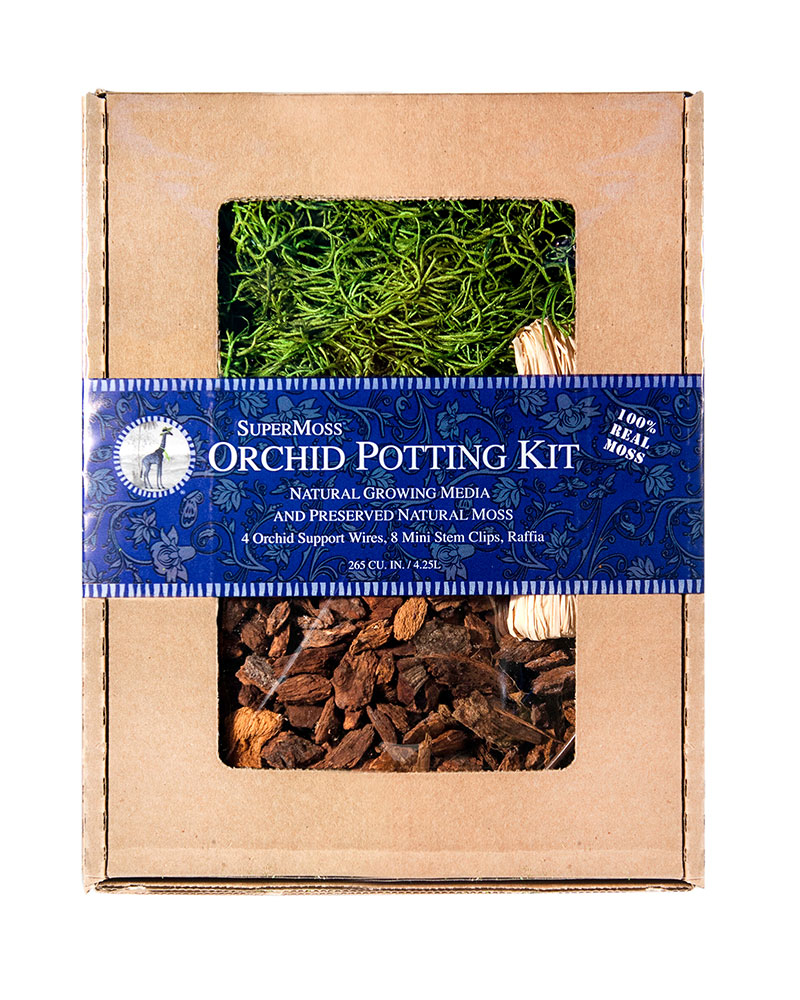 The SuperMoss Orchid Potting Kit makes a great gift or all-in-one-buy for orchid lovers. The kit comes elegantly wrapped in our 4oz and 8oz display boxes. The 8oz kit dresses four orchids, and the 4oz dresses two. Included are 4 stakes, 8 floral clips, a raffia bow, Preserved Spanish Moss, and our professional Orchid Growing Mix. Complete with photos and heirloom growing tips, our kits truly have all you need to start creating your next show-stopping arrangement!Details