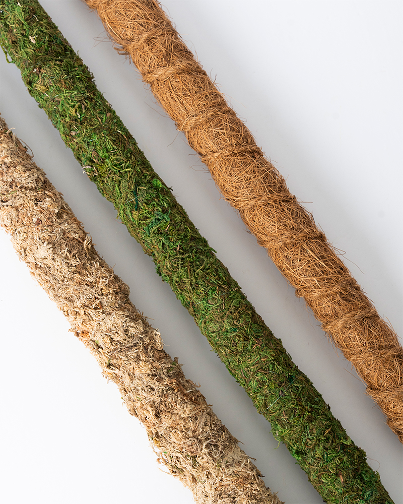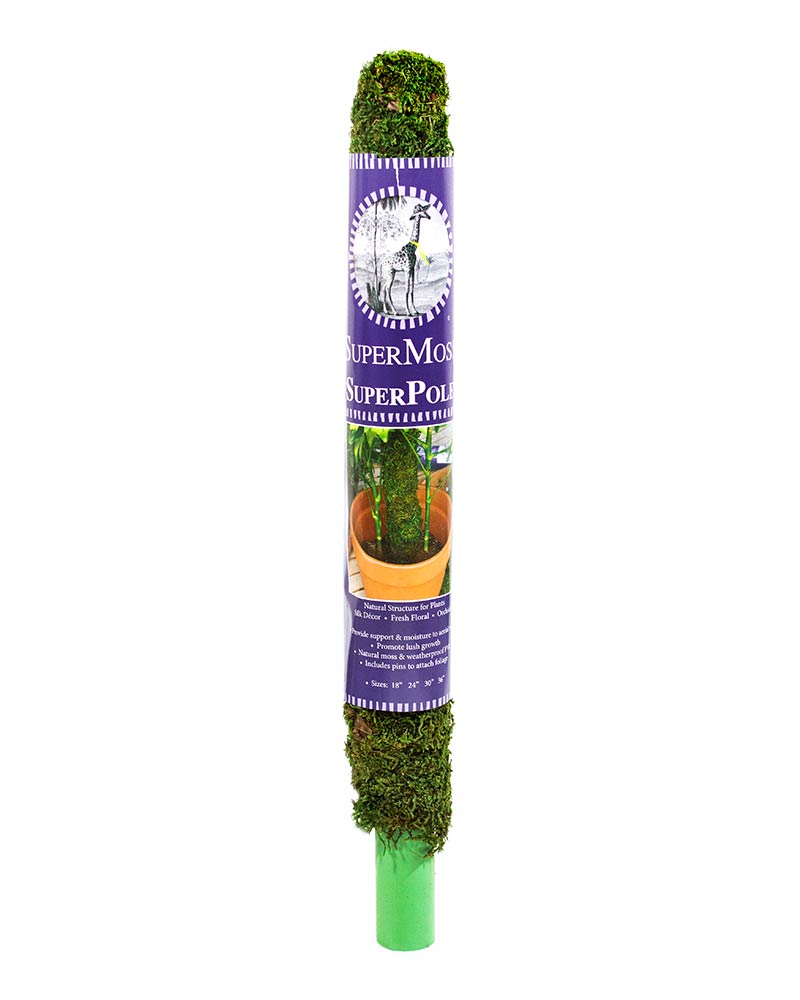 In nature, many forest plants achieve lush growth by climbing along tree trunks and attaching their roots to moss-covered bark. SuperMoss Moss Pole is a naturally absorbent support pole that helps aerial roots take hold and creates an ideal habitat for many climbing and upright plants. It's the next best thing to growing your plants in a forest! The SuperMoss Pole includes metal pins to easily secure the branches and foliage. This natural plant support comes in four different sizes and is also available in Blond Sphagnum. This product works great with our Moss Floral Wire! Available in SuperMoss retail packaging or in bulk quantities.Details