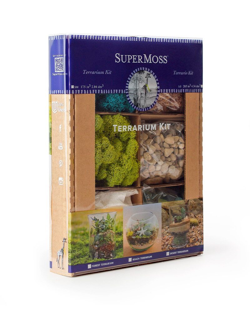 A terrarium is an easy, fun, and artistic way to bring the beauty of nature inside your home. Our Beach, Desert, and Forest Terrarium Kits include all the elements you need to create a multi-layered nature-inspired environment. Begin by choosing a clear glass container. Terrarium glassware can be found in many shapes and sizes! Some good terrarium examples are repurposed pasta sauce jars, cookie jars, old bottles, flower vases, and many other types of household glassware. Finally, you can select your own plants based on your terrarium environment.Details